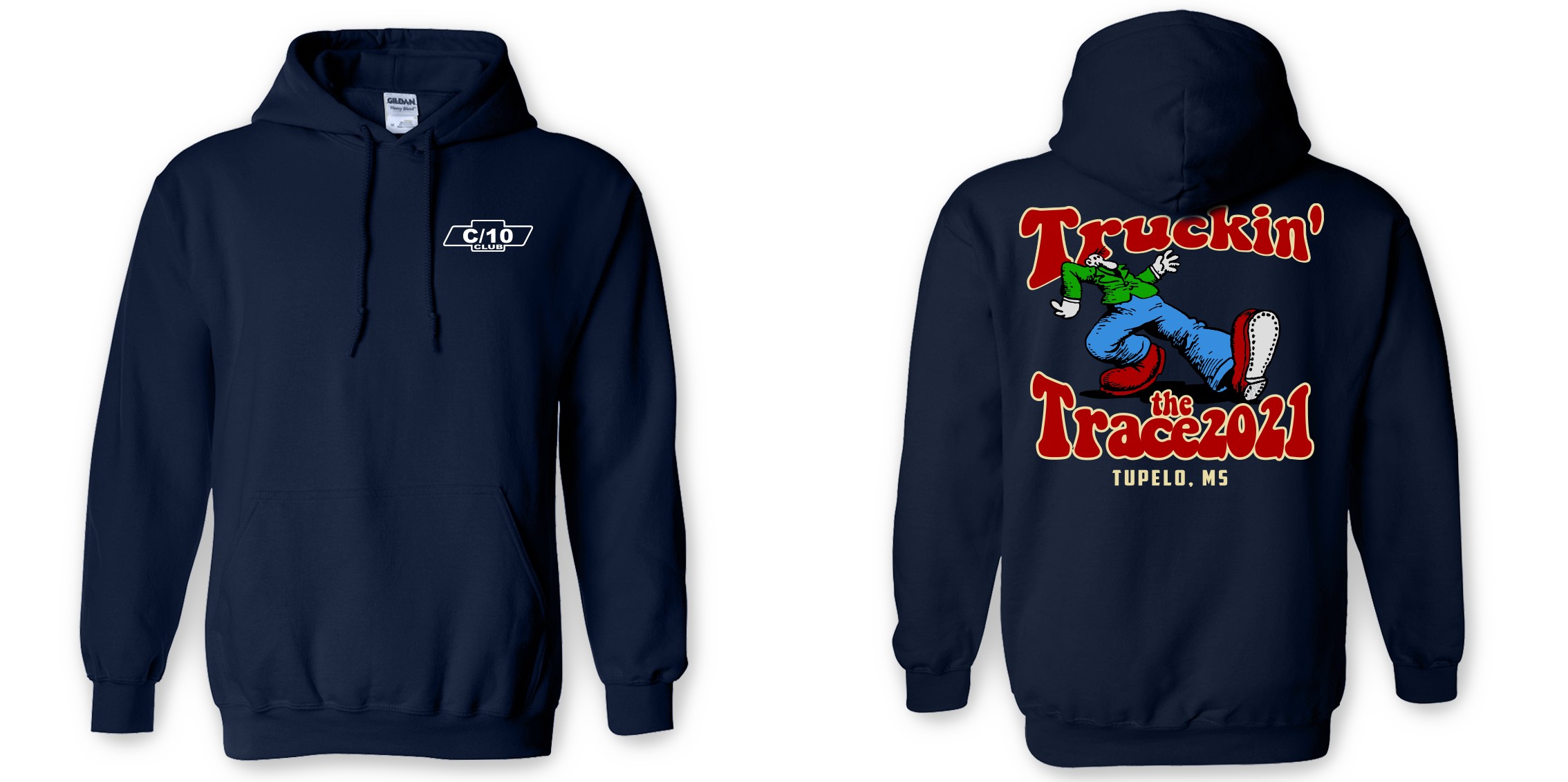 Dark blue pull over style hoodie with the C10 club logo on the front and the Truckin the Trace (Keep on Truckin-style) graphic on the back. These hoodies are Gildan 50/50 and run true to size